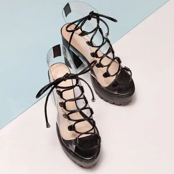 Womens Transparent Lace-Up Platform Heels | Open-Toe Block Shoes in Black, White, Yellow